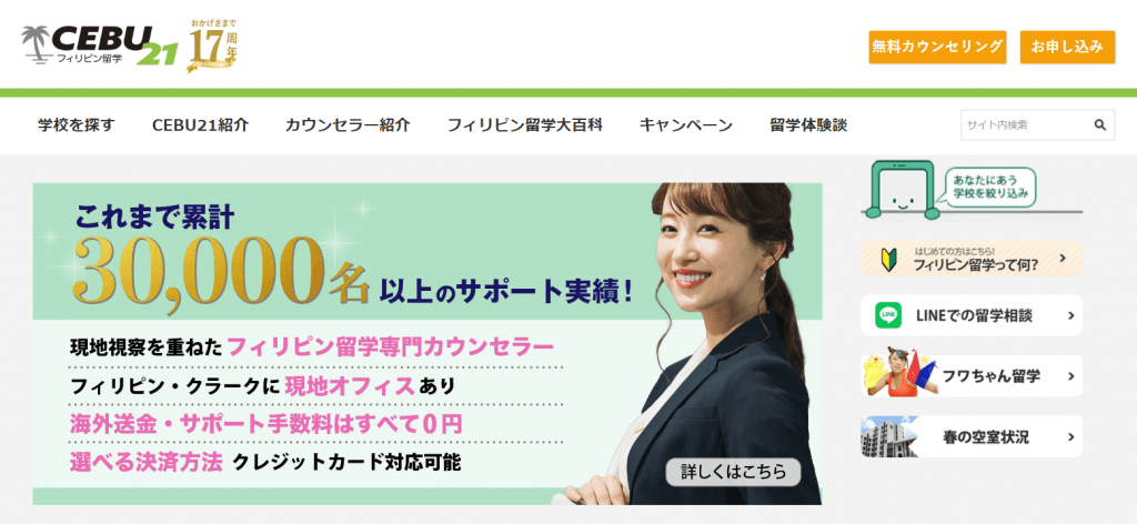 CEBU21は、日本で初めてフィリピン留学代理店をスタートしたフィリピン専門の留学エージェントです。2005年に創業、これまでに18,000人以上の留学生を受け入れています。カウンセラー全員がフィリピン留学経験者かつNPO留学協会認定のプロカウンセラーで、CEBU21の取扱基準に満たない学校は一切紹介しないというこだわりがあります。全社員がフィリピンへ視察に訪れており、ローカル情報にも強く、インターネットでは拾いにくい留学事情や学校選び、勉強方法の話を聞くことができます。